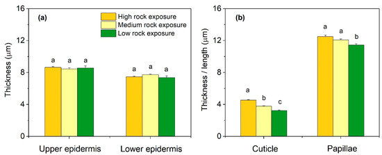 Leaf epidermal traits of Phyllostachys glauca from three habitats (high rock exposure, medium rock exposure, and low rock exposure) in the limestone mountain. (a), the thickness of upper epidermis and lower epidermis; (b), the thickness of cuticle and the length of papillae. Values are means ± S.E. (n = 100). Lowercase letters that differ within an anatomical trait indicate significant (p < 0.05) differences among different habitats.