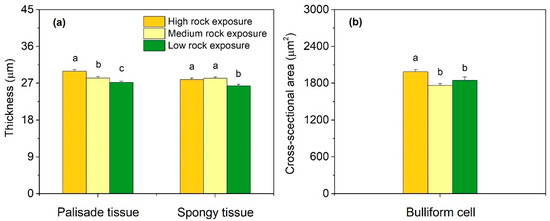 Mesophyll anatomical traits of Phyllostachys glauca from three habitats (high rock exposure, medium rock exposure, and low rock exposure) in the limestone mountain. (a), the thickness of palisade and spongy tissue; (b), the cross-sectional area of bulliform cell. Values are means ± S.E. (n = 100). Lowercase letters that differ within an anatomical trait indicate significant (p < 0.05) differences among different habitats.