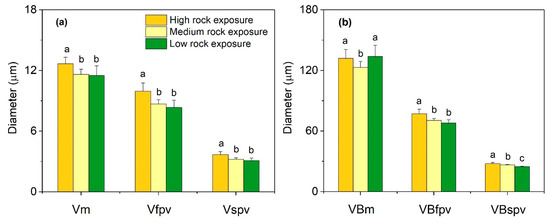 Vascular anatomical traits of Phyllostachys glauca from three habitats (high rock exposure, medium rock exposure, and low rock exposure) in the limestone mountain. (a), the vessel diameters of different veins; (b), the vascular bundle diameters of different veins. Vm, vessels of midrib; Vfpv, vessels of first-order parallel vein; Vspv, vessels of second-order parallel vein; VBm, vascular bundles of midrib; VBfpv, vascular bundles of first-order parallel vein; and VBspv, vascular bundles of second-order parallel vein. Values are means ± S.E. (n = 100). Lowercase letters that differ within an anatomical trait indicate significant (p < 0.05) differences among different habitats.