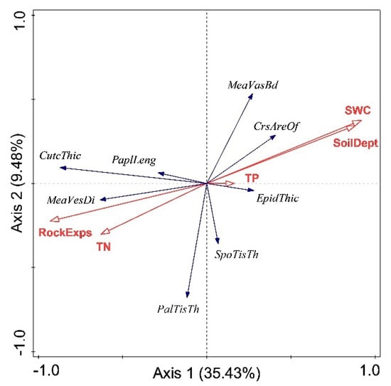 Redundancy analysis (RDA) of relationships among leaf anatomical traits and edaphic factors for Phyllostachys glauca in the limestone mountain. CutcThic, cuticle thickness; PaplLeng, papillae length; MeavasBd, mean vascular bundle diameter; CrsAreOf, cross-sectional area of bulliform cell; EpidThic, epidermis thickness; SpoTisTh, spongy tissue thickness; PalTisTh, palisade tissue thickness; MeaVesDi, mean vessel diameter; SWC, soil water content; SoilDept, soil depth; TP, soil total phosphorus; TN, soil total nitrogen; and RockExps, rock exposure. Blue lines represent leaf anatomical traits, and red lines represent edaphic factors.