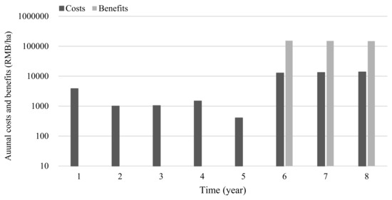 | Weeding | Weeding 3 times per annum in years 1–3 and once per annum in years 4–8, 300 RMB/ha | 1–3 | 900 |