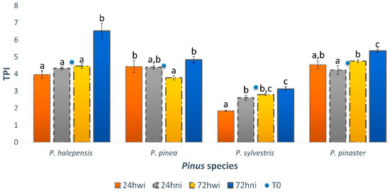 | P. pinea | 0.74 ± 0.02b | 9.82 ± 0.93a | 4.31 ± 0.15b | 50.13 ± 3.33a,b | 2.79 ± 0.47 | 0.48 ± 0.02b | 2.72 ± 0.44a,b | 9.00 ± 2.24a | 15.30 ± 0.50b | 0.44 ± 0.03a | 174.39 ± 19.91b | 25.65 ± 3.49a | 16.12 ± 1.81a | |