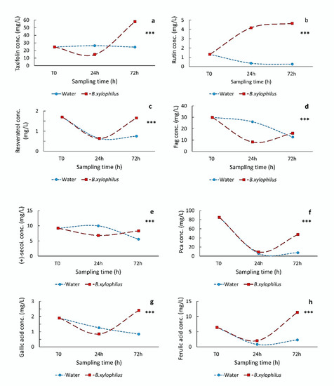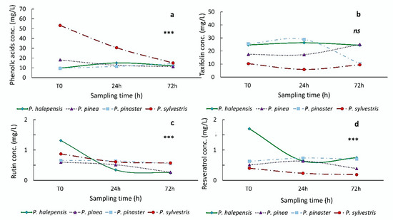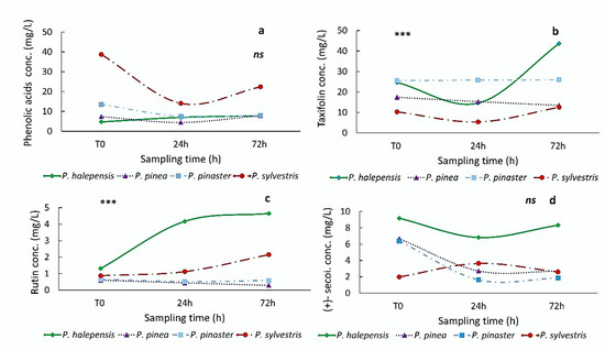 - Canas, S.; Trindade, C.S.; Sun, B.; Naves, P. Phenolic compounds involved in pine wilt disease: HPLC-based method development and validation for their quantification. J. Plant Biochem. Biotechnol. 2021, 30, 343–353. [Google Scholar] [CrossRef]