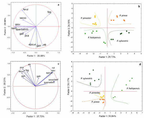 | P. pinaster | 0.88 ± 0.04a | 24.71 ± 5.84b | 6.01 ± 0.17d | 26.31 ± 4.82 | 5.63 ± 1.19 | 0.74 ± 0.06b | 1.78 ± 0.20a | 14.74 ± 0.97a | 28.85 ± 5.22b | 0.64 ± 0.04b | 214.17 ± 11.29b | 57.35 ± 1.81b | 21.59 ± 1.90a | |