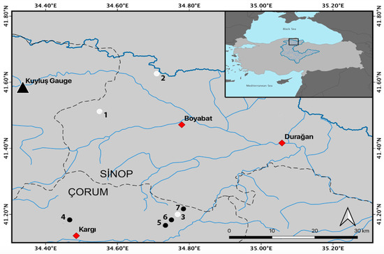 Tree-ring chronology sites in Kızılırmak River Basin. The white circles represent the newly sampled sites for this study (1 = HAC, 2 = MEM, 3 = BED), the black circles represent previously published chronologies (4 = KAR, [22]; 5 = IKI, (Akkemik et al. unpublished data); 6 = TIR, [4]; 7 = SAH, [22]) and the gray triangle represents the Kuyluş gauge on Kızılırmak River.