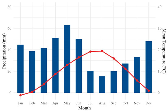 We used CRU TS4.04 gridded at a resolution of 0.5° × 0.5° for monthly total precipitation and mean temperature datasets from the KNMI Climate Explorer [39] for the grid-covering tree-ring sites and streamflow gauge in the lower KRB (41°0′–41°30″ N, 34°30′–35°0′ E). We selected the period of 1930–2003, which maximizes the meteorological stations’ recording period in the area. The climatic diagram of lower KRB shows that the basin receives higher precipitation from December to June (reaches the highest value in May) and lowest from July to September (reaches the lowest value in August). The highest mean temperatures were observed during the months of July and August (Figure 2).