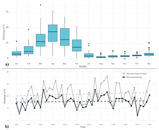 (a) The monthly hydrograph for Gökırmak River (at Kuyluş) gauge for the period of 1954–1998. The boxes of the boxplot representing half of the central data which start with the first quartile and end with the third quartile. Horizontal black line in the box represents the median. (b) The mean annual (black) and mean April–August (gray) discharge (m3/s) with trend lines (dashed). The trend function is y = −102 + 0.0624x for mean annual discharge and y = −33.4 + 0.0248x for mean April–August discharge, where y indicates discharge and x indicates year.
