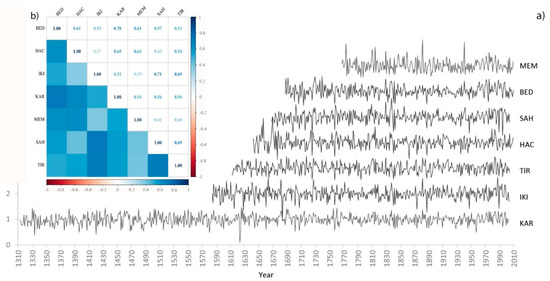 (a) The site chronologies and (b) correlation coefficients among each chronology for the period of 1794–2003. All correlation coefficients are significant (p < 0.01 for MEM and IKI, p < 0.001 for the remaining ones).