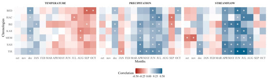 The correlation coefficients of climate variables with the tree-ring formations between 1930–2003 (except TIR, 1930–2000). Asterisk symbols represent the statistically significant months.