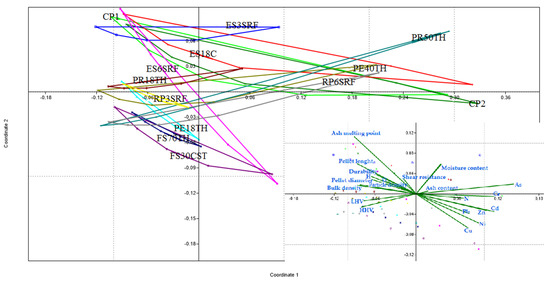 nMDS analysis of main pellet characteristics in terms of possible differences among thirteen pellet types studied (light green: CP1; dark green: CP2; red: ES18C; blue: ES3SRF; violet: ES6SRF; dark violet: FS30CST; dark blue: FS70TH; light blue: PE18TH; olive green: PE40TH; dark red: PR18TH; teal: PR50TH; yellow: RP3SRF; light grey: RP6SRF). The diagram in the right corner shows the detail of the biplot analysis for the relationship among studied coordinates and characteristics.