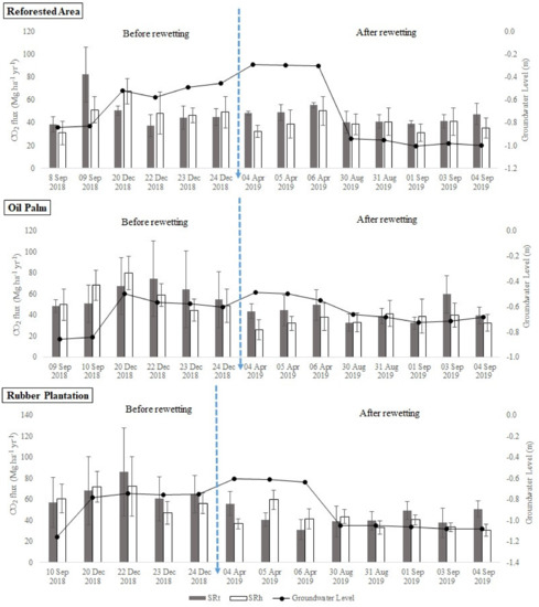 - Swails, E.; Hertanti, D.; Hergoualc’h, K.; Verchot, L.; Lawrence, D. The response of soil respiration to climatic drivers in undrained forest and drained oil palm plantations in an Indonesian peatland. Biogeochemistry 2019, 142, 37–51. [Google Scholar] [CrossRef]