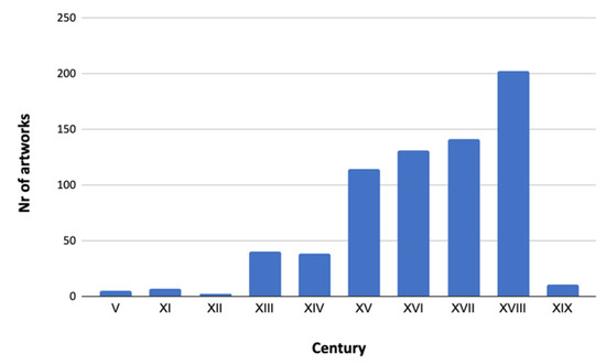 With respect to the historical period of production, in Figure 2, it can be seen how the listed artworks are distributed between the 5th century (a few cases corresponding to the carvings of the door of the paleo Christian church of Santa Sabina in Rome), up to the century. The great majority were created between the 15th and 18th centuries. Among the artefacts of the 15th century, those made in central Italy prevail, while for those of the 18th century, the clear prevalence is for artworks from northern Italy.