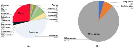 On the left (a) is the distribution of the identified timbers, while on the right (b) is the hardwood anatomical typologies.