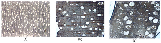 (a) is a type of wood with diffuse porosity (poplar), (b) is a type of wood with semi-diffuse porosity (walnut), and (c) is a porous-ring type of wood (chestnut).