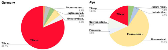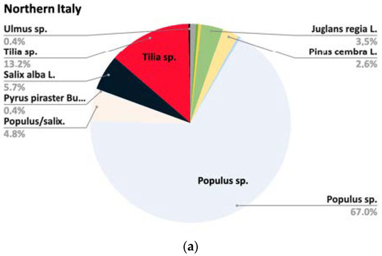 Nevertheless, by analysing the distribution of wood in the three geographical areas of Italy, it can be seen that it changes from north to south. However, the results revealed that the type of wood used in various geographical–cultural areas can only be partially justified by the ecology of the plants. In Figure 5 and Figure 6, it is clearly seen how the clear prevalence of poplar in the works carried out in northern Italy becomes less important in central Italy, to drastically decrease in the works of the central–southern cultural sphere, where it is the limewood that becomes prevalent.