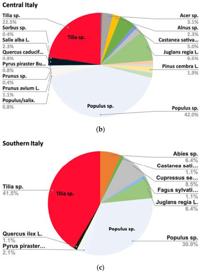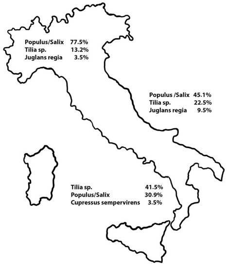 The various species that make up the genus Populus (or even Salix) grow in fact throughout Europe in environments rich in water content of the soil. Populus alba, P. nigra, and P. tremula are the three species endemic in Italy, and the three are diffused in central and southern Europe. Populus tremula has a larger area, spread on mountains from north Africa to the Scandinavian peninsula [33].