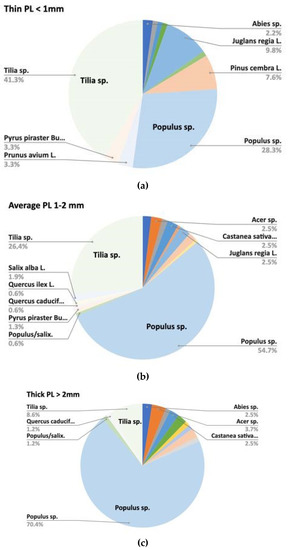 Distribution of timbers based on grades of preparatory layer thickness ((a): Preparatory layer thin; (b): preparatory layer 1–2 mm; (c): preparatory layer thick).