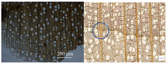 On the left is a cross-section of willow wood, and on the right, of limewood; the circle highlights the rays that widen crossing the ring limit.