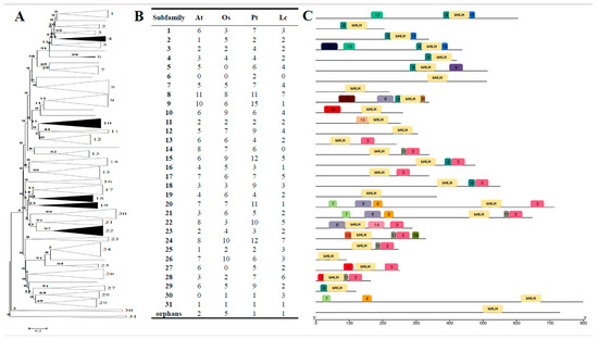 Phylogenetic tree of four species proteins. (A) The phylogenetic tree of four species; Liriodendron (Lc), Rice (Os), Arabidopsis (At), Poplar (Pt). The branches with a bootstrap value greater than 50 were represented by black triangles, while those with a bootstrap value less than 50 were represented by white triangles, which are divided into 31 subfamilies. (B) Summary of each group plant-species member representation in phylogeny analysis, plant species, (At) Arabidopsis, (Os) Rice, (Pt) Poplar, and (Lc) Liriodendron, group presentation denoted relative to their group marked as subfamily. Orphan genes are shown in the bottom column denoted orphans. (C) The motif patterns of LcbHLH subfamilies, showing the bHLH domain present in all protein sequence analysed and other motif.