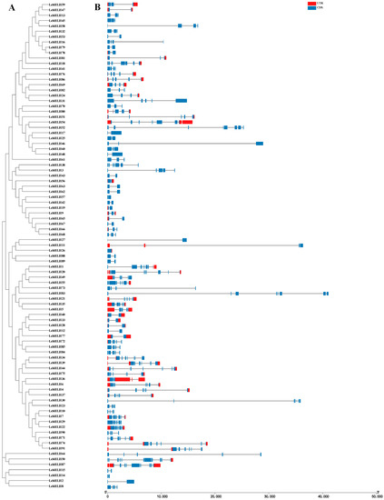 Phylogenetic relationships and exon/intron structures of LcbHLH protein. (A) The phylogenetic tree of LcbHLH protein. (B) Exon/intron structure analysis of LcbHLHs. Blue boxes represent CDS, red boxes represent UTR, and gray lines represent introns. The size of exons and introns can be estimated by the scale at the bottom.