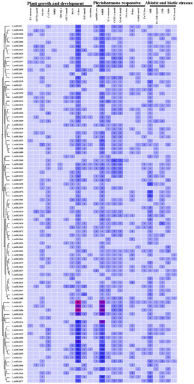 The cis-regulatory element plays an imperative role in regulating the expression of stress response genes [33]. The presence of the cis-elements of the LcbHLH members in the promoter region (2000 bp upstream of the transcription initiation site) was predicted. Twenty-five typical elements with relatively robust functions were divided into three groups shown in Figure 3. Based on the functional annotations, cis-elements were categorized into three major classes: plant growth and development, phytohormone responsive, and abiotic and biotic stresses (Figure 3). Our findings showed that G-Box and ABRE were the most represented transcription factors in the LcbHLH gene family. Specifically, LcbHLH7 had the most representation of G-Box and ABRE. 67 LcbHLH members had elements responsive to the methyl Jasmonate, including CGTCA-motif and TGACG-motif. Fifty-four members had gibberellin-responsive elements, including P-box and GARE-motif. Seventy-two members had salicylic acid responsiveness elements, TCA-element. Moreover, 45 members had auxin-responsive elements, including AuxRR-core and TGA-element. 52 LcbHLHs contained LTR elements that might be interrelated to the cold stress response of L. chinense.