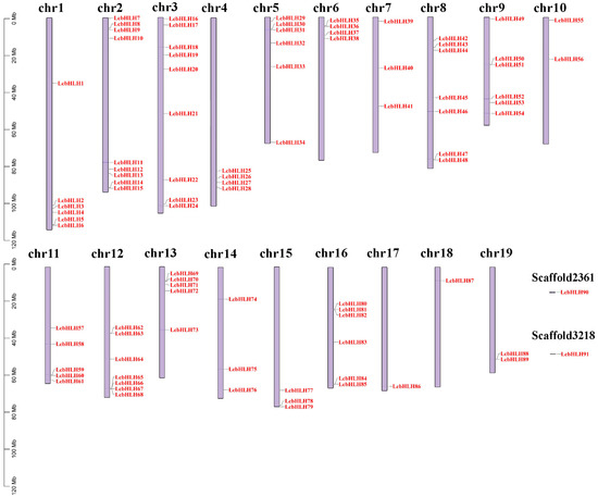 Amongst 91 LcbHLH genes, 89 were distributed on 19 chromosomes, and the other two were assigned to unassembled genomic contigs (Figure 4). The number of LcbHLH genes on each chromosome ranged from 1 to 9.