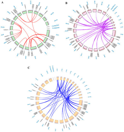 Fragment replication and chromosome distribution of bHLH genes in Liriodendron chinense. (A) Nineteen chromosomes were represented by green segments, red lines connected with homologous genes. (B) Collinearity analysis of Liriodendron chinense and Arabidopsis thaliana; (C) Collinearity analysis of Liriodendron chinense and Rice. The gene pairs between them are represented by purple lines and blue lines respectively.