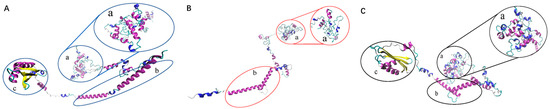 Three-dimensional structure of bHLH protein. a, b and c represent same protein regions in three different protein structures, respectively. (A) Three-dimensional structure of the protein of LcbHLH24; (B) Three-dimensional structure of the protein of LcbHLH72; (C) Three-dimensional structure of the protein of AtICE1.