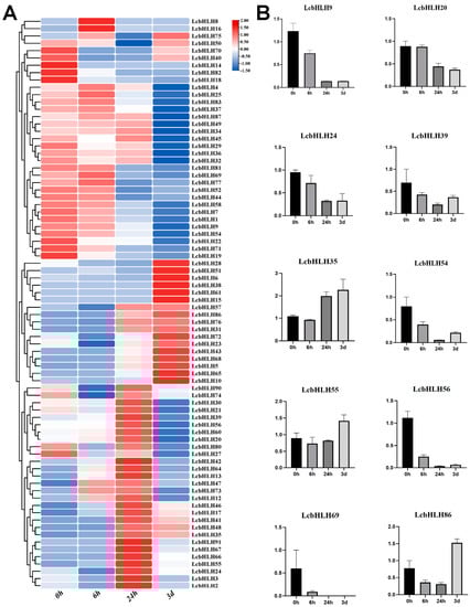 Expression analyais of LcbHLH genes in response to cold stress. (A) Transcriptomic expression analysis of LcbHLH genes. (B) Expression analysis of LcbHLH genes by qRT-PCR. 0h, 6h, 24h and 3d represent the treatment times of cold stress.
