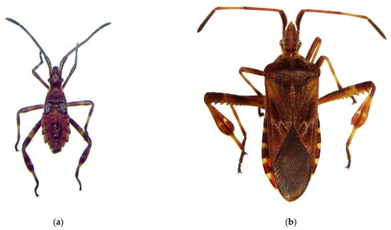 The bug overwinters as adults or nymphs of the last (V) instar. For overwintering, they aggregate in cracks in the bark and other similar microhabitats in forests and can also penetrate dwellings, cars, etc. They leave overwintering shelters in April to May and start feeding on young microstrobili and megastrobili, causing growth impairment, deformation, and reducing the production of microspores []. Then, the adults mate and the females lay eggs. Females lay about 30 eggs (up to 80 maximal) in clusters along the needles []. Hatched nymphs and adults feed on maturing and ripe seeds and also suck sap from the apical shoots throughout summer. Adults emerge close to the end of August.