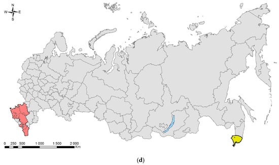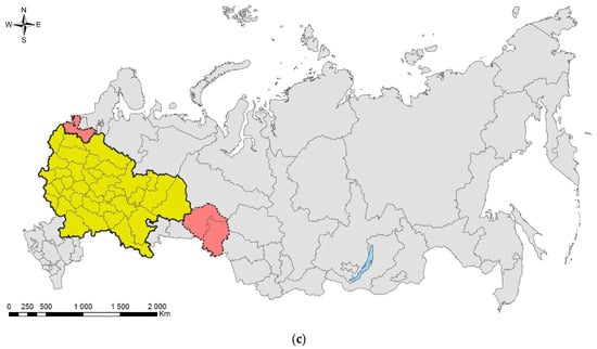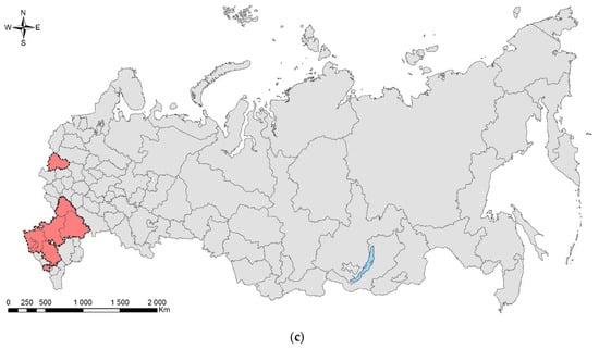 The species was described from East Siberia (Transbaikalia: Berezovka settlement) []. In Russia, it is distributed across its Asian part: in West Siberia (Tyumen Oblast, Krasnoyarsk and Altai Krais, the Altai Republic), East Siberia (Tyva and Buryatia), and Far East (Primorskii and Khabarovsk Krais, Sakhalin, and Amur region) (Figure 4c).