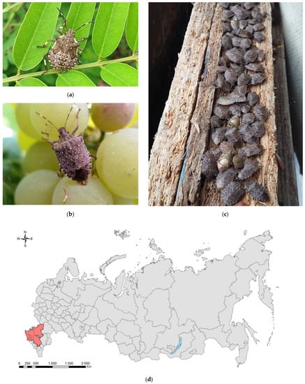 The brown marmorated stink bug, Halyomorpha halys: (a) a nymph of the final (V) instar, Sochi, August 2017; (b) an adult on grape, Sochi, September 2017; (c) an overwintering aggregation in warehouse, Sochi, January 2018; (d) the current invasive range in Russia (colored in red). Photo: (a) by V.Ye. Zakharchenko and (b) and (c) by N.N. Karpun.
