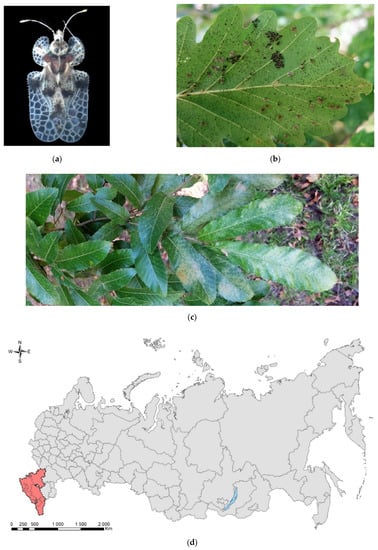 Nymphs and adults suck juices from leaves, resulting in a pronounced discoloration, which is first seen as a marbled diffuse yellowing of foliage, and by the middle of summer, as complete discoloration due to chlorophyll loss [,]. Despite growing population densities, the bug impact on oak forests in Russia has not been estimated yet. Significant destruction of foliage in tree crowns during several years can greatly weaken the oaks, causing their gradual decline [,]. In addition, the decorative quality of trees massively infested by the oak lace bugs is significantly reduced, which may be critically important in urbanized environments [].
