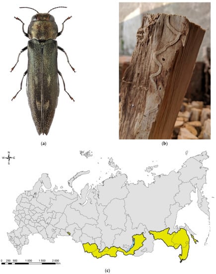 Russia occupies a huge territory in Europe and Asia with different climatic zones, and the country is actively involved in international trade. Thus, it is not surprising that harmful organisms, arriving to the country via international trade (e.g., airfreight or shipping containers carrying crops, ornamental plants, wood, etc.) or through the movement of people (e.g., global tourism), are regularly detected here [], and those that succeed in becoming established cause significant economic losses to Russia []. The opposite is also true. Pests are regularly found on plants and plant material in vehicles driving from or through the territory of Russia and, as a result, are recorded in new regions of the country or beyond, in foreign countries []. Information about the biology, monitoring, and control of alien invasive species that actively expand their ranges and have recently arrived in Russia or, in contrast, native species that are able to spread from Russia to other countries, is of a high importance for international specialists dealing with pest quarantine and forest protection in their homelands.