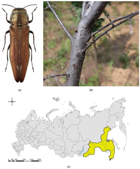 The apple buprestid, Agrilus mali: (a) a male; (b) exit holes of A. mali on a dead Malus sp. tree, Beijing District, China; (c) the native range in Russia (colored in yellow). Photo (a) by A.V. Kovalev, after []; (b) by E. Jendek, both with permission.