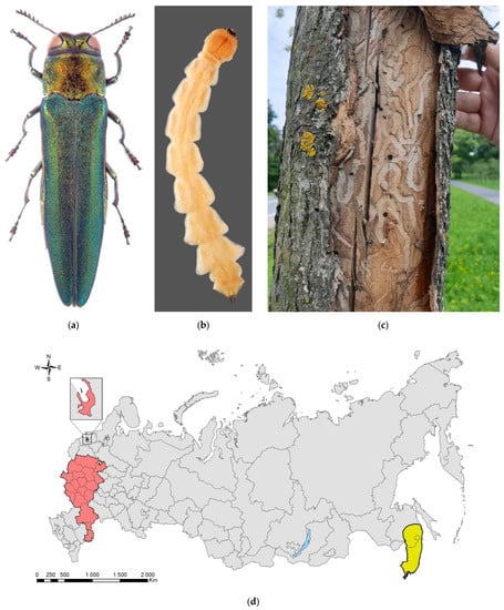 The emerald ash borer, Agrilus planipennis: (a) an adult; (b) a mature larva; (c) larval galleries and exit holes in young tree, Saint Petersburg, September 2020; (d) the current distribution in Russia: the native range (colored in yellow) and invasive range (colored in red). Photo: (a) by K.V. Makarov, (b) by A.V. Kovalev, after [], both with permission, (c) by M.G. Volkovitsh.