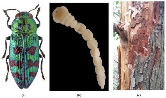 Agrilus planipennis (Figure 6) is described from China (Beijing) []. Since the beginning of the XXI century, the emerald ash borer has turned from a little-known East Asian species into one of the most devastating pests of ash trees in the world []. It has killed millions of trees in the forests and urban plantings in North America, European Russia, and East Ukraine [,,,,].