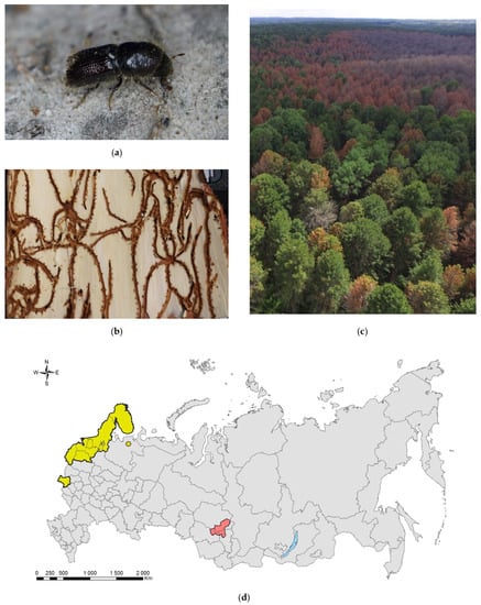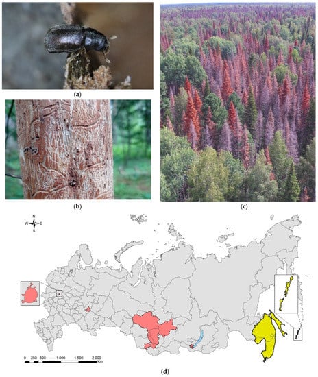 The small spruce bark beetle, Ips amitinus: (a) an adult on a branch of Pinus sibirica, Tomsk Oblast, 2021; (b) galleries on P. sibirica, Tomsk Oblast, 2021; (c) I. amitinus foci in the Siberian pine forest near settlement Luchanovo, Tomsk Oblast, June 2020; (d) the current distribution in Russia: the native range (colored in yellow) and invasive range (colored in red). Photo by I.A. Kerchev.