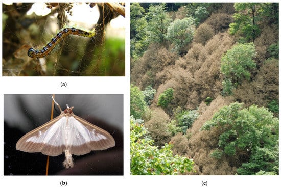 - Ermolaev, I.V.; Zorin, D.A. Ecological consequences of invasion of Phyllonorycter issikii (Lepidoptera, Gracillariidae) in lime forests in Udmurtia. Entomol. Rev. 2011, 91, 592–598. [Google Scholar] [CrossRef]