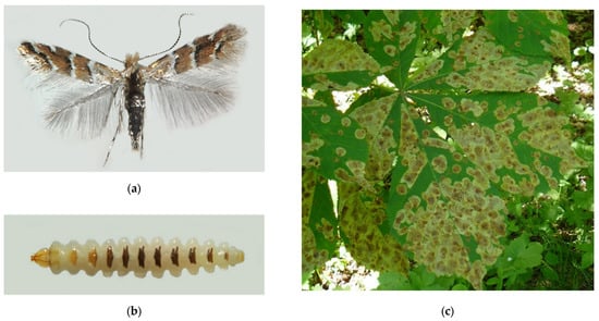 - Kryukova, A.V.; Nikolaeva, Z.V. Harmfulness of chestnut mining moth in Pskov region. Bull. Velikoluk. State Agric. Acad. 2018, 1, 1–7. Available online: https://elibrary.ru/download/elibrary_35034180_72824990.pdf (accessed on 18 January 2022). (In Russian).