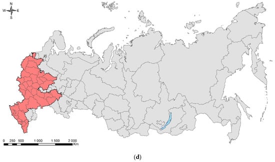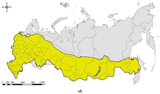Outside its native range, A. planipennis was first recorded in the USA (Michigan) in 2002 [] and in the European part of Russia—in Moscow City in 2003 [,,,]. By early 2022, the emerald ash borer was recorded in 5 provinces of Canada and 35 states of the USA []; 18 provinces of European Russia, Moscow City, St. Petersburg City (Figure 6d); and two provinces of Ukraine (Luhansk and Kharkiv) [,,,,,].