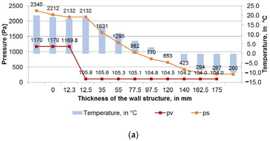 The determination of the heat flux through a flat wall and of the vapour flux allows the determination of temperature variations, respectively of the vapour partial pressures on the thickness of each wall layer, variations that are in both cases linear. The heat flux through the wall was first calculated with Equation (2) for an indoor temperature (ti) of 20 °C, and outdoor temperature (te) of −10 °C. Following the calculations, the variation of the partial pressure (pv) and the saturation pressure (ps) were represented in the diagrams in Figure 8 for all investigated wall structures.