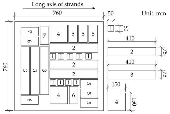 The wood strands were conditioned to 3% MC. A commercial liquid phenol-formaldehyde adhesive (CL5357) with a solid content of 51% obtained from LRBG Chemicals Inc. (Longueuil, QC, Canada) served as an adhesive at a content of 5% (oven-dry wood mass) in an in-house made drum blender. A wax emulsion with a solid content of 58% was applied at a rate of 1% (oven-dry wood mass). Water was added to make the MCs of the surface and core layers furnish at 8% and 7%, respectively. The blended strands were placed in a mold using a screening box to align them in the desired direction. The orientation of the surface layer strands was perpendicular to the core layer’s strands. The mass proportion of the surface/core/surface layers was 30:40:30. The final size of the OSB panel was 760 mm by 760 mm by 15 mm. The mat was hot pressed to a 600 kg/m3 target density at a temperature of 210 °C and a pressing cycle of 355 s (closing + holding + opening time) using a hot press (Dieffenbacher North America, Windsor, ON, Canada; maximum operating pressure of 9500 kPa) equipped with the PRESSMAN control system developed by the Alberta Research Council (Edmonton, AB, Canada) located at the CRMR, Université Laval, Quebec City, QC, Canada. Six types of OSB panels were manufactured (Table 1), representing various combinations of the species used. There were three replications of each OSB panel type. The pressing process consisted of a one-step closure schedule developed by Wang et al. [31] (Table 2). After hot pressing, the panels were stored in a conditioning chamber at 20 °C and 65 % relative humidity to obtain an equilibrium moisture content (EMC) of 8%. The cutting plan of the produced OSB is shown in Figure 1.