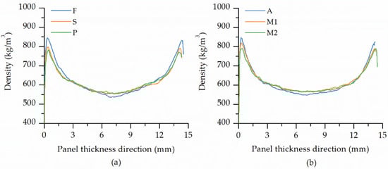 Figure 2b shows a similar result among the panels containing aspen. The aspen panels (A) had the steepest profile compared to the 33.3% spruce/66.6% aspen mixture panels (M1) and the 66.6% spruce/33.3% aspen mixture panels (M2), with a higher surface density and lower core density. The difference in density between the surface and core layers of the panels was slight with an increase in species wood density.