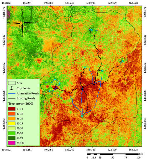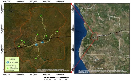 The existing road network in Angola and, in particular, Huambo province was initially constructed to cover the local population’s basic needs. The civil war that ended in 2002 played a determinative role in the existing road networks. About one-third of the entire road network in Angola can be described as good; the rest is either considered to be fair or poor [54,55]. In the vicinity of Huambo province, there is no appropriate access to the forest areas and connectivity with the main road network to support local economic activities, such as wood extraction and transportation to the processing mills around the major cities.