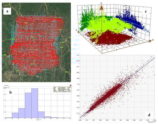 Illustrations of different steps of DEM preparation: (a) created path in Google Earth Pro, (b) histogram of values, (c) trend analysis tool, (d) scatterplot of observed elevation vs. estimated elevation.