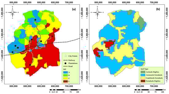 (a) Distribution of roads inside the management zones (MZ) based on the land cover changes [6] and (b) classification of soil types into 4 classes.