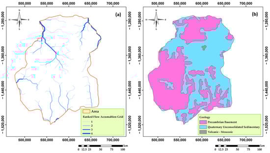 (a) Water flow accumulation and (b) geological features maps in the study area.