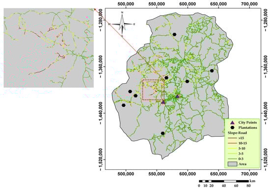 Slope stability is considered the basic requirement of any road built on an inclined plane in road planning and construction. At least 75% of the surface area in the province is covered with little slope (0–5%) (Figure 4b), thus denoting favorable areas for road construction because they have lower levels of rain impact, run-off velocity, and soil erosion. To avoid or minimize erosional environmental impacts, careful attention must be given to road development and planning, especially in steep terrain. It is much better to have a poor road in a good location because the poor road can be fixed, but an inferior road location cannot [52,57]. The location of potentially dangerous slopes on existing roads (Figure 8) provides a good overview of where to securely open new forestries considering all the variables that influence the construction of roads (Figure 9 and Figure 10). This means to potentially access environmental risks and identify construction difficulties at the road planning stage.