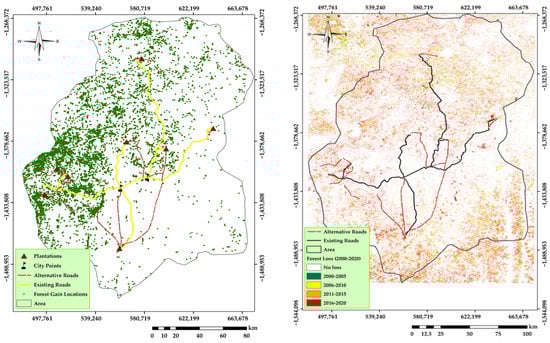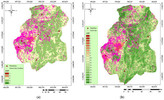 Figure 10 shows an overlay of AHP information with forest gain where it is observed that forest gain is mainly achieved in zones with less road access, while forest loss can be observed all along in the areas with access (Figure 12). The results are important for monitoring purposes of tree cover (Figure 13) in the future, where we can follow the trends for forest gain and forest loss. The main concern is whether building a road network in non-suitable areas can improve forest conservation, regeneration, and management (Figure 12 and Figure 13).